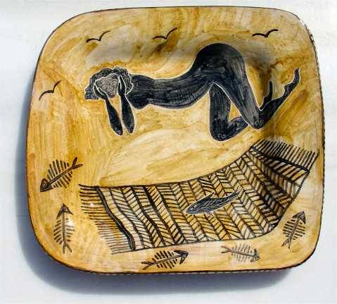 Handbuilt square plate in black and yellow with woman and mat with fish bones and flying bird